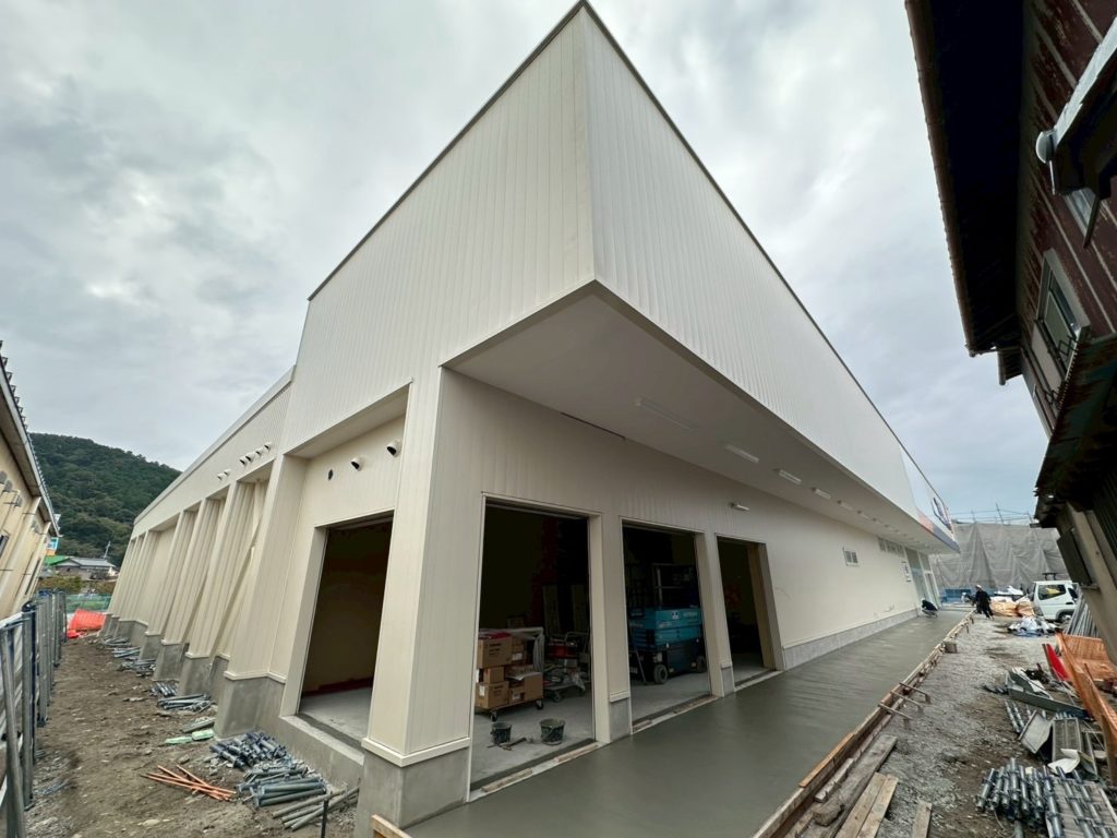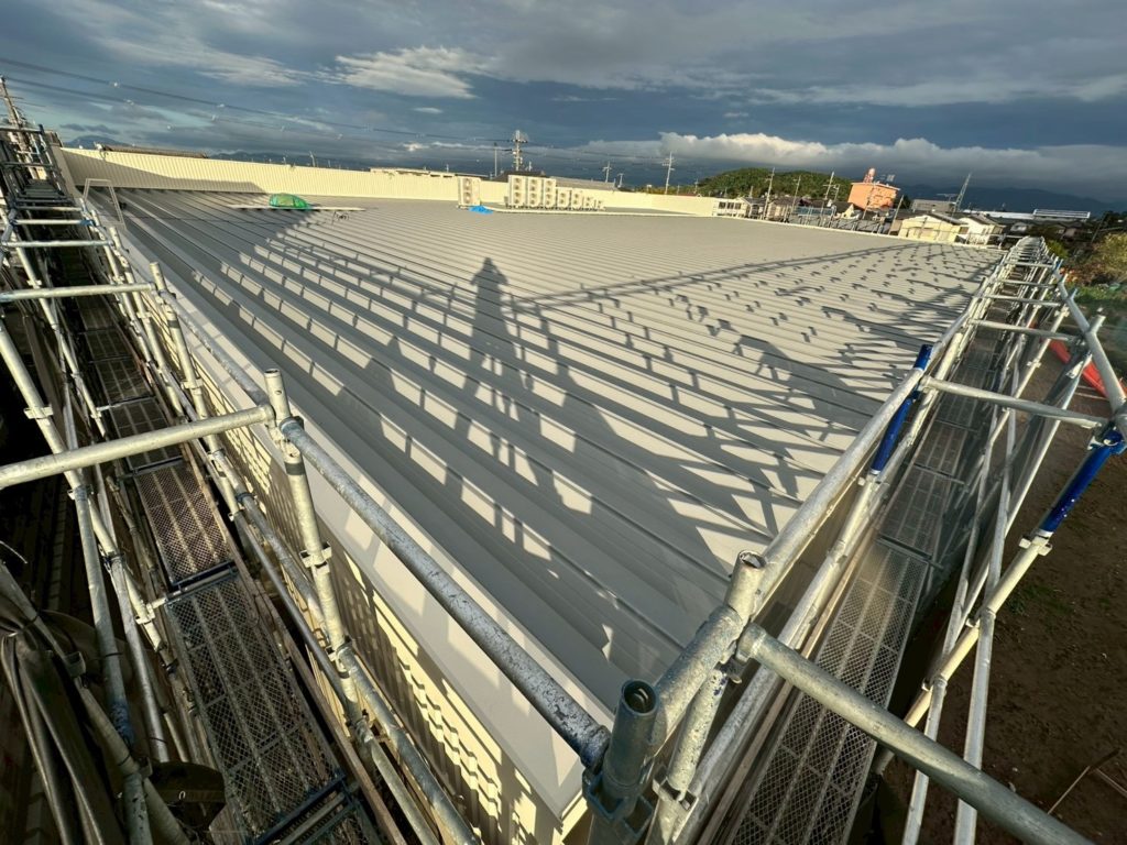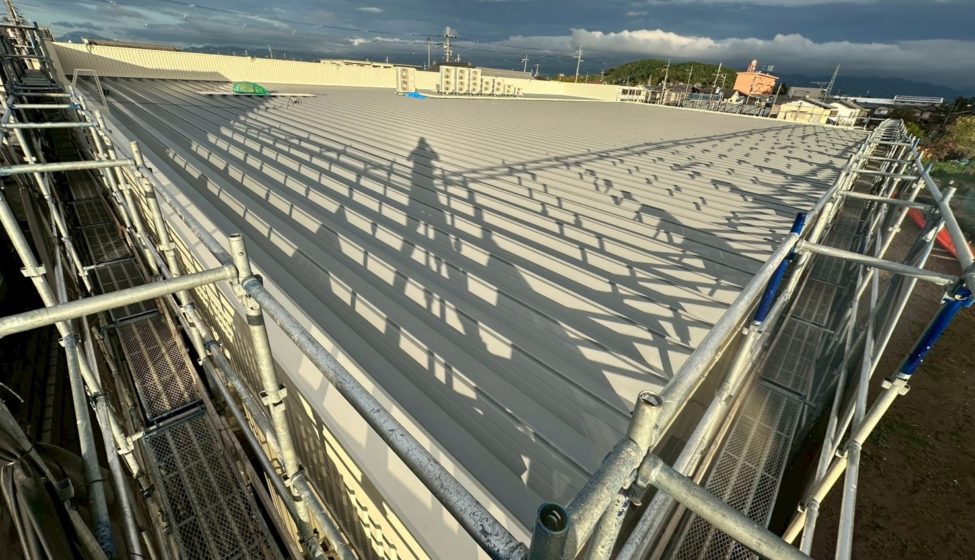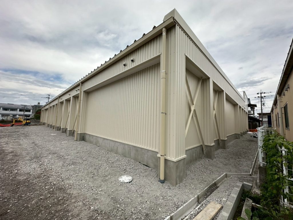 外壁の垂直ブレスの角波張りが大変でしたが、かっこよく納まりました。